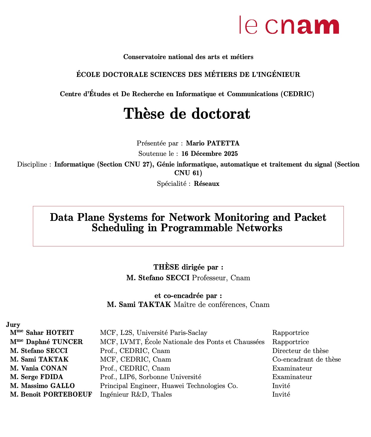 PhD Title (French): Systèmes de Plan de Transfert pour la Surveillance et l’Ordonnancement des Paquets dans les Réseaux Programmables