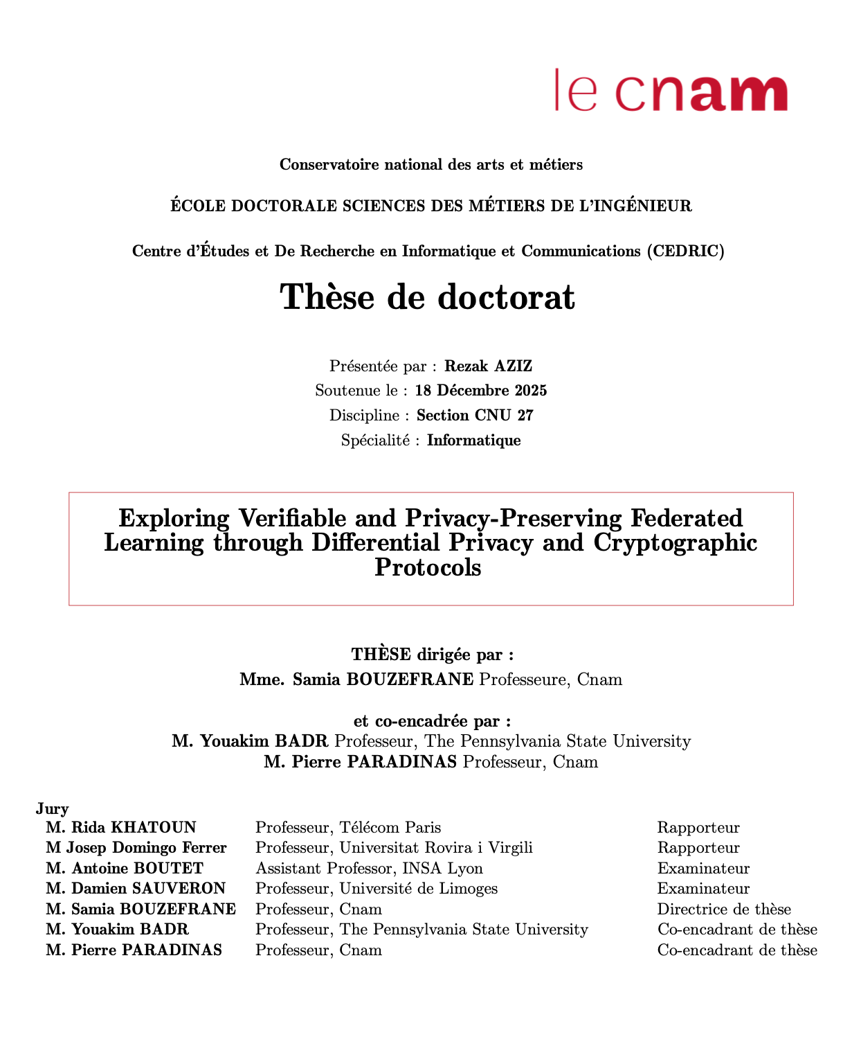 PhD Title (French): Exploration de l’apprentissage fédéré vérifiable et respectueux de la vie privée grâce à la confidentialité différentielle et les protocoles cryptographique