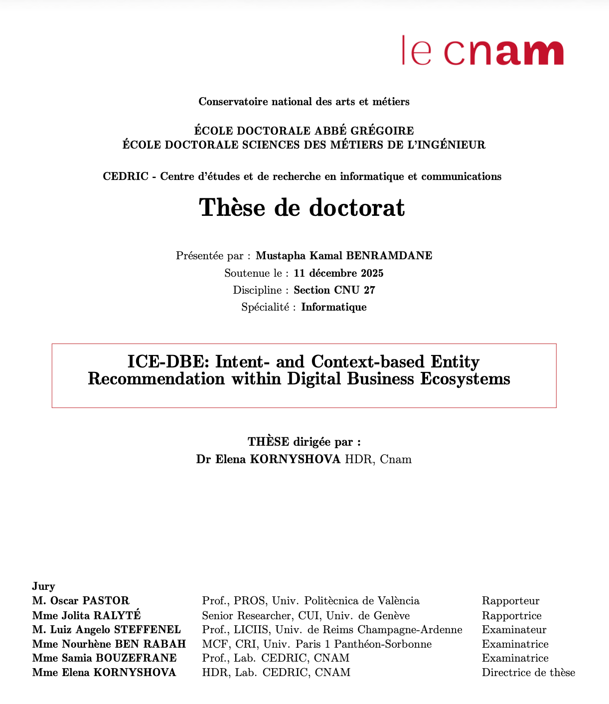 Thesis Title (French): ICE-DBE: Recommandation d’entités basée sur les intentions et le contexte au sein des écosystèmes d’affaires numériques